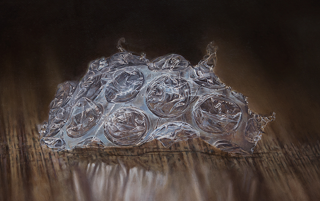 The paintings are of found objects, which are still in situ out in the world after all useful life has been extracted from them.  Their existence, meaning, fascination and purpose, often created by advertising, has been removed.  The objects were the carriers of pleasure and worth but are now just regarded as rubbish.  The paintings reflect what remains when there is nothing left. I see them as metaphors for the human experience, where people are used, consumed and discarded by others. This is reflected in the titles of each painting.