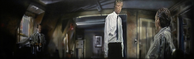 The manipulation of film time and re appropriation of the scene creates a false environment never directed, edited or filmed, offering a second view and narrative directed, edited and painted by the artist. Thus creating another level and world mediated by the artist/director when it is transferred from a film image to a painting.