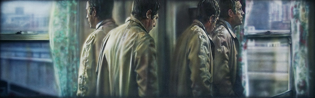 Figures and scenes from films are edited so characters and situations happen at different times; characters interact with others from previous or future stills from different points in the original movie. The manipulation of film time and re appropriation of the scene creates a false environment never directed, edited or filmed, offering a second view and narrative directed, edited and painted by the artist. Thus creating another level and world mediated by the artist/director when it is transferred from a film image to a painting. The artist becomes the director editing the film image creating narratives that exist only on the painted surface, the painting becoming the world that the viewer sees and can relate to on different levels depending on their experiences within their own outside world or previous experiences.