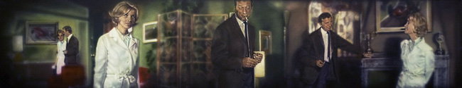 As I contemplate Simon Taylor's Film Panoramas, the two-dimensional paintings come alive, coil, and draw me into their world. I am confronted by enigmatic images that seem to swirl round in a mysterious dance: we view the characters who people these paintings from different angles, we try to see into their minds, see what distractions trouble their brains. The pleasure is in the puzzling: on the page or stage, the Prince; on the wall of the gallery, the paintings.
