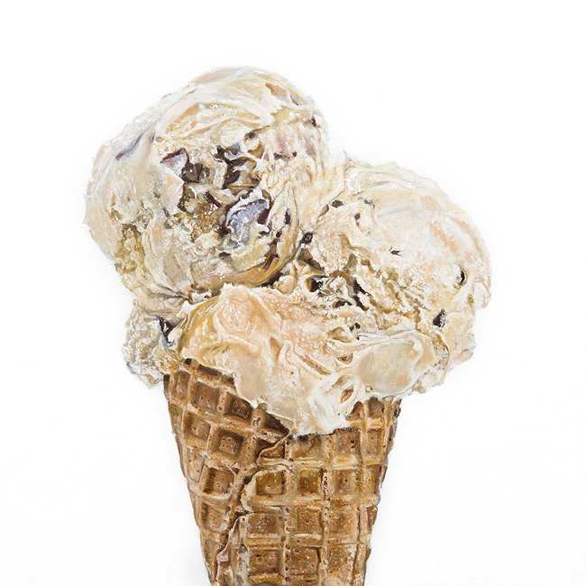 I really love the whimsical and playfulness of painting food, with this series I have decided to paint ice creams. I want them to be bright, fun engaging and maybe a little nostalgic whilst also being mouth watering and inviting. I love the way oil paint can mimic the frozen and velvety texture of the ice cream and also the crispness of the cone. I feel that photorealistic style creates a sense of familiarity and comfort as if the ice cream could be plucked straight from a summer afternoon.