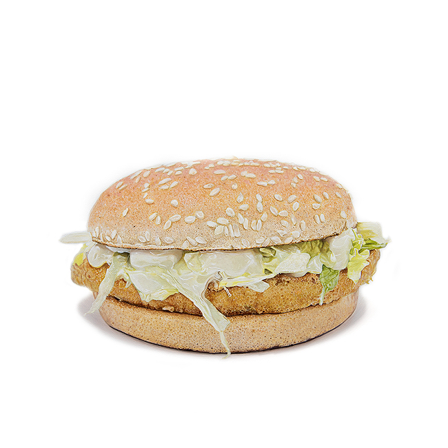 McChicken® Sandwich, 2023 Coated Chicken Patty, Sesame Bun, Lettuce (Iceberg) and Sandwich Sauce. Oil Paint on Linen, 350 x 350mm